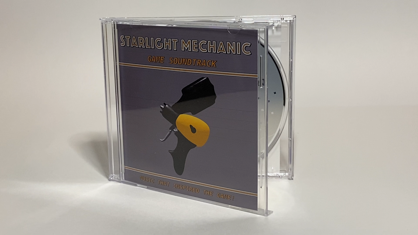 A 12-track CD consisting of songs that inspired the game. The CD comes in a clear jewel case with custom front and back cover art that I made in photoshop. All but one of the songs on the CD came from the Youtube Studio Audio Library.