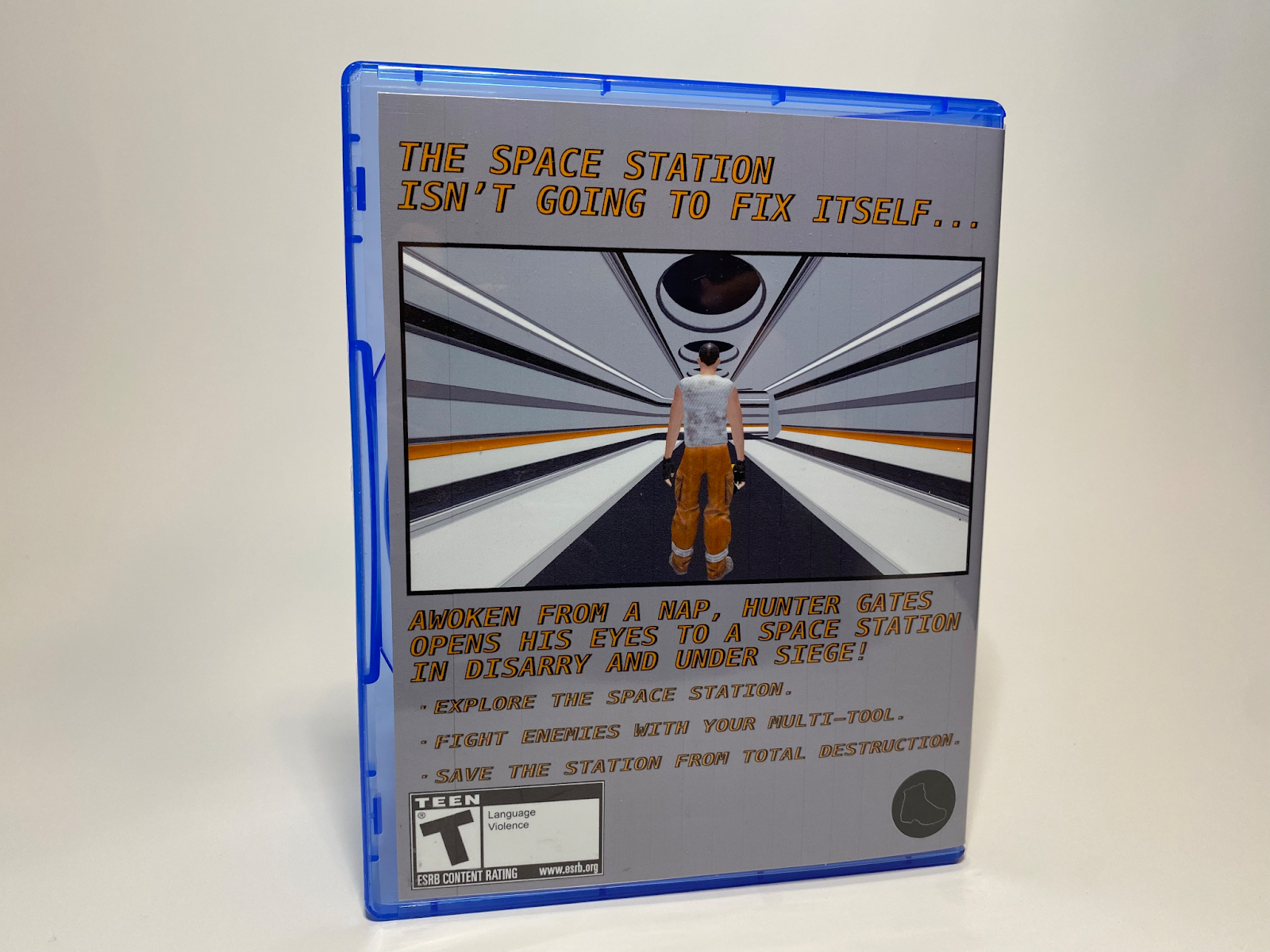 For the Plastic Blu-ray case, I created the box art in Adobe Photoshop, mixing together in-game screenshots, modified Adobe fonts, and images found online in order to make the box art look authentic. Once the box art was finished, I printed it out on 80-pound photo paper. I already had some Blu-ray cases so I cut the box art to fit inside the plastic sleeve.