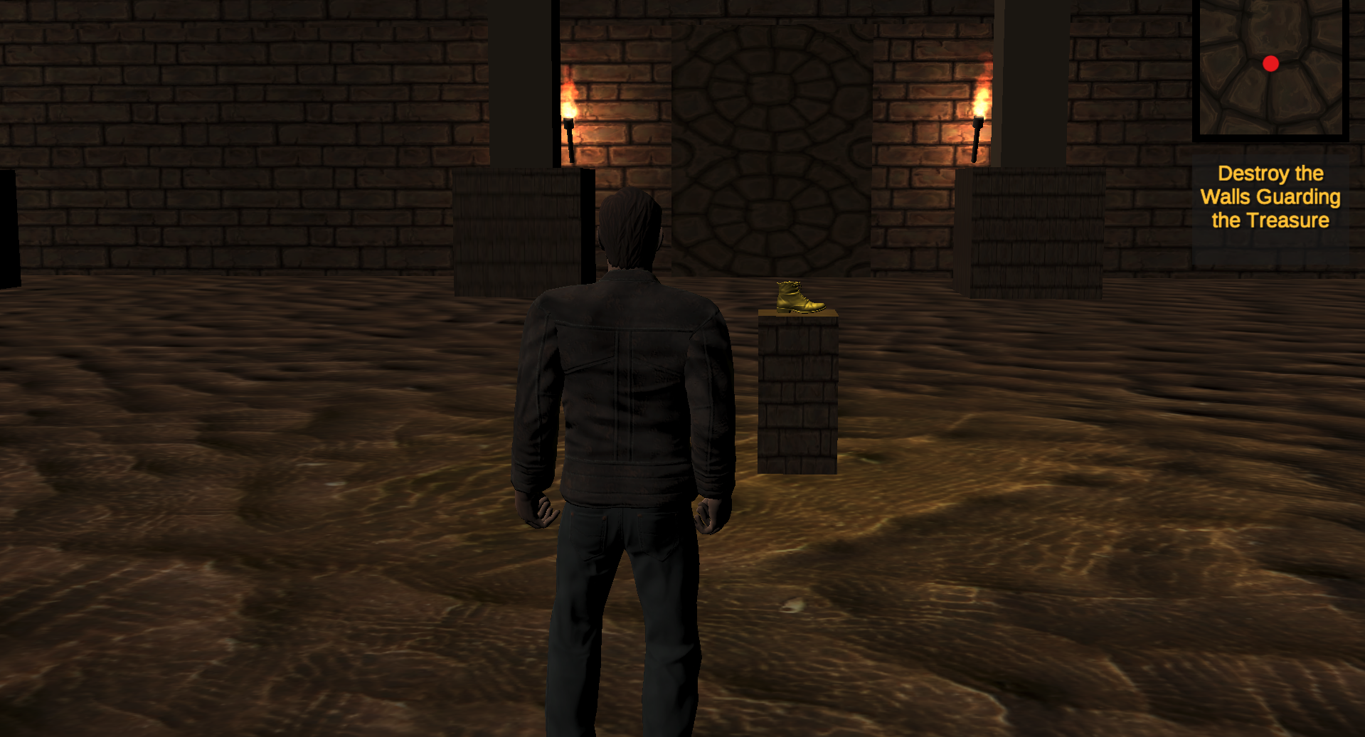 When originally designing the mechanics of the game, I wanted each level to be randomly generated using a bunch of different hallways, rooms, and puzzles. Unfortunately I wasn’t able to get that system to work, so I instead decided to just make three different levels and have the game randomly select one level when the play starts the game. With the overall level appearance, I wanted it to have a desert aesthetic that included sandy floors, pillars, and sandy block walls. For the treasure, I thought it would be a funny idea to tie it back to the branding I had made previously for myself and made the treasure a golden boot. I also incorporated a song that would loop while playing the game that helped set the overall mood. I found the song through Youtube’s Studio Audio Library. Overall, for my first attempt at making a dungeon crawler game, I think it came out great.